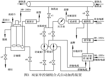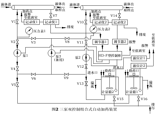 三臺計量泵中,泵3為泵l、泵2的備用泵,通常情況下,泵1、泵2分別在二套交流變頻式自動加藥控制系統(tǒng)驅(qū)動下工作,使泵可以按四種方式工作,控制柜上的切換開關(guān)可將備用泵投入運行。