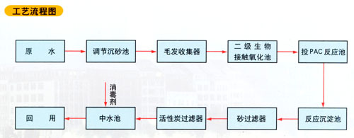 HYS系列中水處理設(shè)備采用生物和物化結(jié)合的處理方法,洗浴等污水經(jīng)中水收集管道自流入調(diào)節(jié)沉砂池,在調(diào)節(jié)池內(nèi)設(shè)有預(yù)曝氣裝置,調(diào)節(jié)池出水經(jīng)毛發(fā)收集器后用泵提升至二級(jí)接觸氧化池,污水經(jīng)生物處理后,進(jìn)入混凝劑,混凝后的水用泵提升至機(jī)械過(guò)濾器及活性炭過(guò)濾器,污水進(jìn)中水池并投加消毒劑,然后中水送至回用系統(tǒng)。